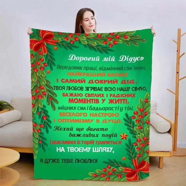 UA MarketКиевMizapShopТовары и услугиДомашний текстильПледы 3DПледы 3D со своим пожеланиямиПледы с пожеланиями для дедушкиПлед 3D новогодний со своими пожеланиями для дедушки «Поздравление для дедушки» 3135_B 15121 135х160 см