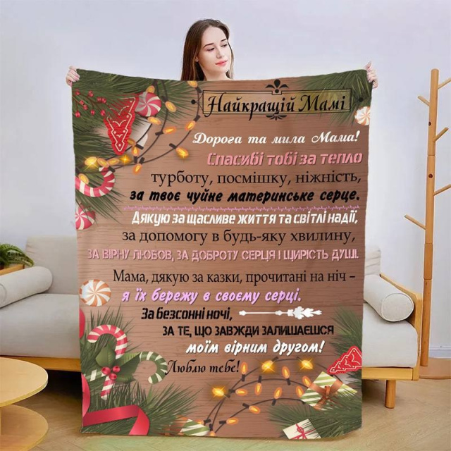 UA MarketКиевMizapShopТовары и услугиДомашний текстильПледы 3DПледы 3D со своим пожеланиямиПледы с пожеланиями для МамыПлед 3D новогодний со своими пожеланиями для мамы «Найкраща мама» 3120_B 15076 135х160 см