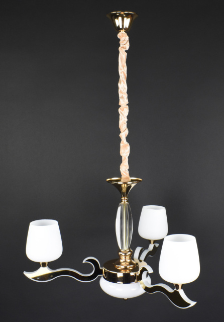 Подвесная Led люстра на цепочке. Три рожка из акрила со светодиодной подсветкой мощностью 45 вт. Три патрона Е14. Плафоны стеклянные размером 12х13 см. Высоту цепочки можно изменить. Декоративный велюровый чулок прикрывает цепочку. Пульт в комплекте. Крепление к потолку на крючек. Основа диаметром 11 см.