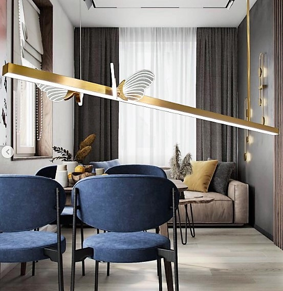 Удлиненная светодиодная подвесная люстра, доступная в черном и золотом цветах. Длина 100 см, минимальная высота 10 см, регулируется, максимальная высота 200 см. Мощность 15 вт, две бабочки на корпусе размером 10х7 см. Материал рассеивания акрил, основание 15х4 см, крепление планка 12 см и трос.