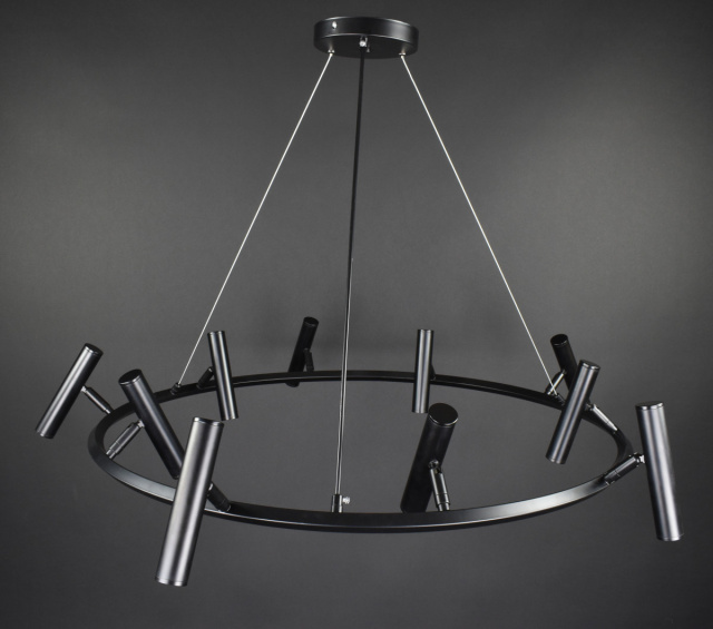 Подвесная Led люстра, высота регулируеться, встроенные светодиоды, мощность 30 Вт, плафоны в виде спотов с поворотным механизмом, размер спота 3х16 см, крепление к потолку на планку, основа диаметром 15 см.