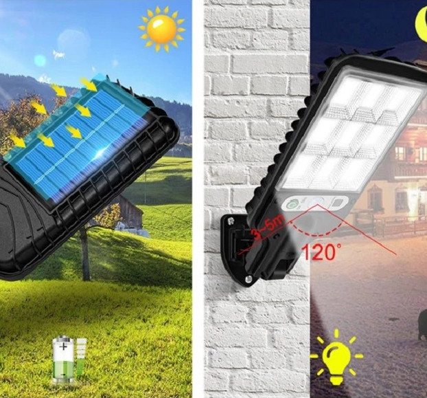 Светодиодный фонарь 11169 на солнечной батарее - это незаменимый помощник для освещения придомовой территории у себя на даче, дома, на стоянках, в парках и тд. Благодаря встроенной солнечной панели, фонарь в течении дня накапливает в себе энергию, с помощью которой работает в темное время суток Данная модель фонаря предусматривает наличие чувствительного датчика движения, за счет которого фонарь моментально начинает работать при наличии малейшего движения в темное время суток. Датчик движения срабатывает с расстояния 7-9 метров, с угла обзора 120 градусов. После установки светильник светит на 50% своей мощности, при обнаружении движения автоматически увеличивает мощность до 100%. Фонарь светит только в темное время суток Фонарь полностью работает от солнечной энергии, не требует сложного подключения к электричеству через провода. Такое устройство дает возможность сэкономить ваши траты на электроэнергию. Устройство изготовлено из пластика и имеет класс защиты IP65. Это означает что вы можете не переживать, устанавливая фонарь на открытом воздухе, он не выйдет из строя при попадании на него влаги или пыли.