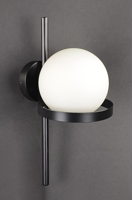 Настенный светильник, корпус изготовлен из металла, размеры 16х39 см, отступ от стены 22 см, плафон стеклянный диаметром 15 см, патрон E27, крепление к стене на планку, основа диаметром 10 см.