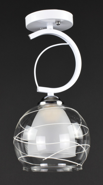 Потолочная люстра, корпус металлический, плафон стеклянный диаметром 15 см, патрон E27 (стандарт), крепление к потолку на планку, основа диаметром 10 см.